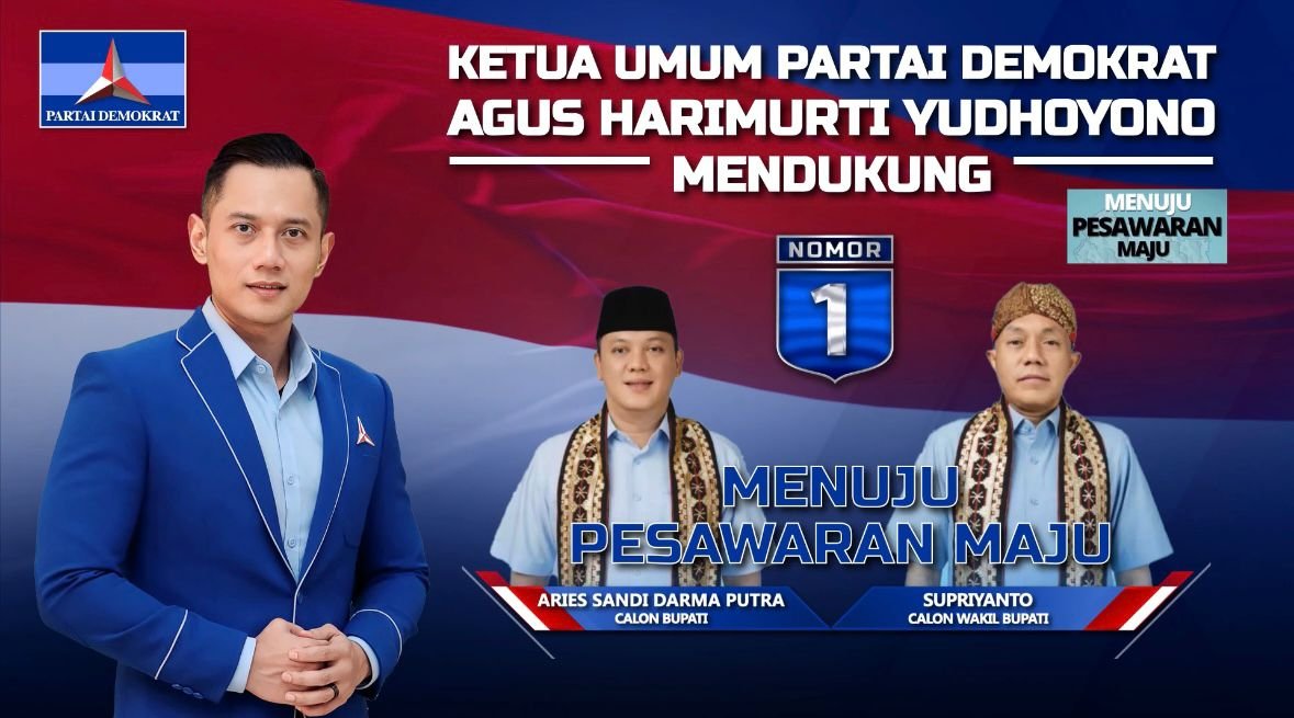 Pesawaran (Duasisi.co.id). : Ketua Umum Partai Demokrat Agus Harimurti Yudhoyono (AHY), memberikan dukungan penuh kepada pasangan calon Bupati dan Wakil Bupati Pesawaran nomor urut satu, Aries Sandi Darma Putra dan Supriyanto.