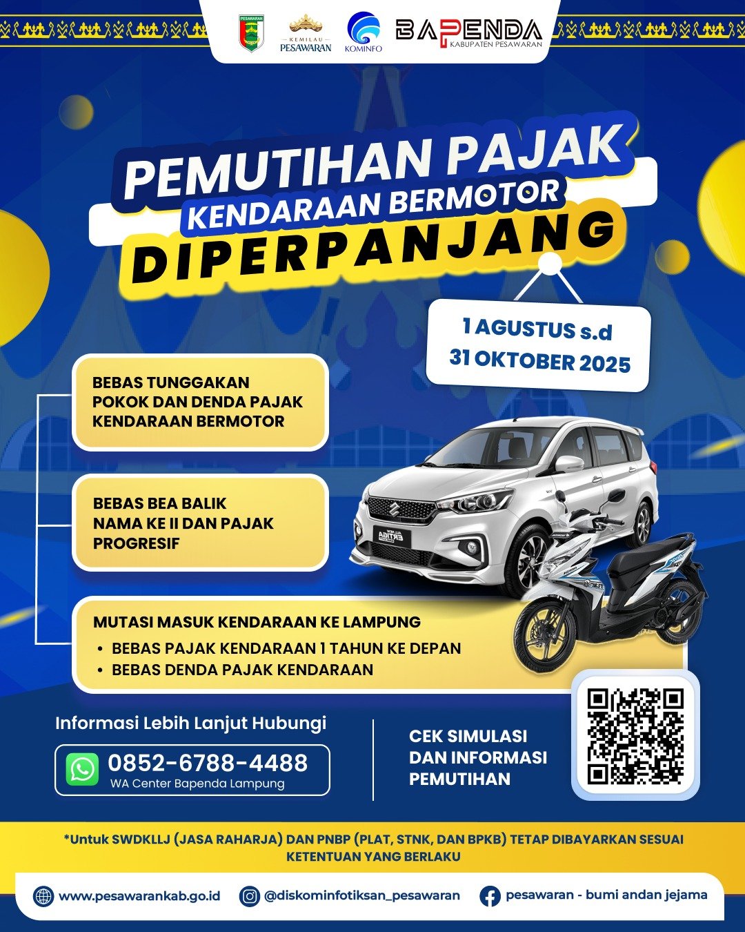 Pesawaran (Duasisi.co.id ) : Kabar baik bagi para pemilik kendaraan bermotor di Kabupaten Pesawaran. Pemerintah Provinsi Lampung resmi memperpanjang masa pemutihan pajak kendaraan bermotor hingga 31 Oktober 2025, sesuai dengan Surat Keputusan Gubernur Nomor G/503/VI.03/HK/2025 tentang Perpanjangan Masa Pembebasan Pokok Tunggakan dan Denda Pajak Kendaraan Bermotor.
